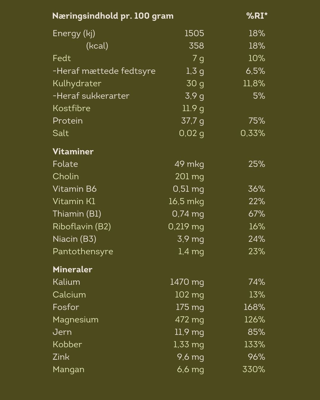 Fuldkorns Havremel* (glutenfri), Ærte protein* og Hampe protein*